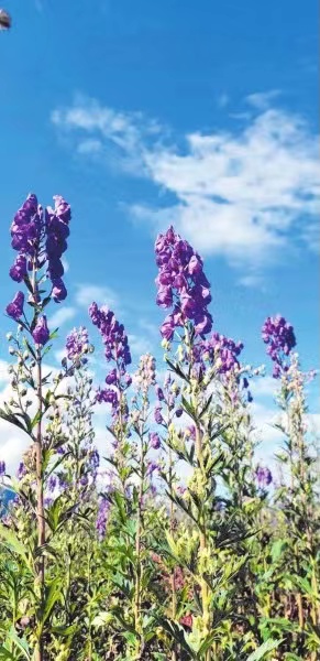 微風(fēng)吹拂,相隔一條小路的不遠(yuǎn)處,200畝附子花海在微風(fēng)中搖曳,紫色的花朵點(diǎn)綴著深秋的布拖大地。今年的附子已經(jīng)成熟,等個(gè)晴好的天氣即可采挖,到時(shí)候,地里又會(huì)呈現(xiàn)出熱火朝天的豐收景象,一個(gè)個(gè)附子“金坨坨”即將破土而出,村民一張張幸福的笑臉將印刻進(jìn)美好時(shí)光。