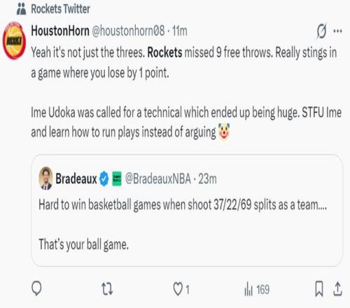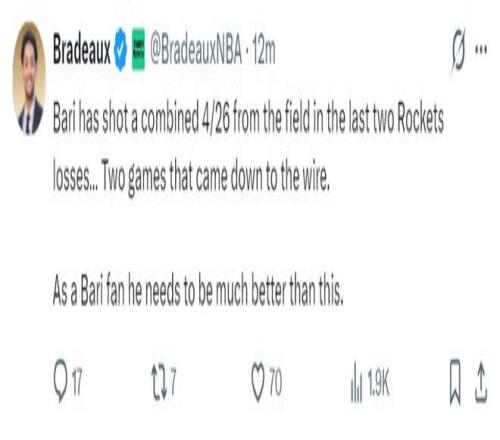 火箭隊記Bradeaux寫道:火箭隊近期接連輸給西部排名15、14、13、12、11、9的球隊,目前火箭戰績22勝12負,火箭凈勝分聯盟第二,這真是一支有趣的球隊。