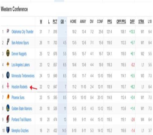 這場比賽后火箭直接從西部第四直落到西部第六,火箭與湖人都拉開0.5個勝場,沒有約基奇的掘金接連擊敗凱爾特人、費城76人再度回到西部第三的位置。