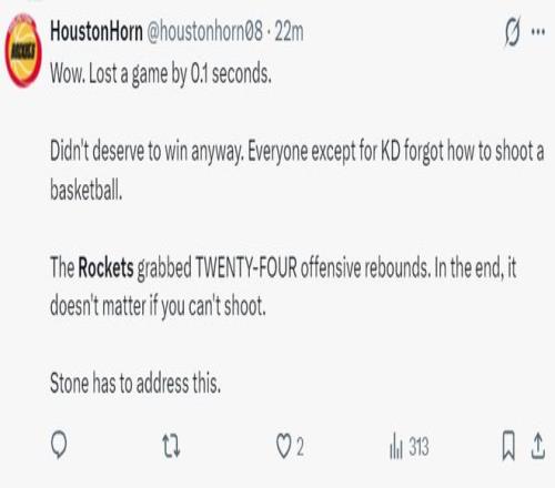 休媒:火箭距離勝利只差0.4秒,實際上他們也不該贏球,除了杜蘭特之外所有人都忘記如何投籃,全隊拼下24個前場籃板,這樣的二次進攻優勢都輸了,斯通必須解決投籃這個軟肋的問題。