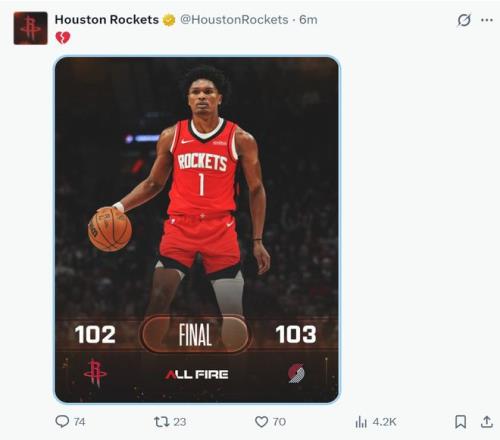 火箭隊這場失利官方都非常心碎,杜蘭特25中14高質高效的拿到35分4籃板,阿門命中率50%斬獲23分13籃板6助攻1搶斷2蓋帽(但有一個關鍵的罰球丟了,如果兩罰全中比賽就可以進入加時);